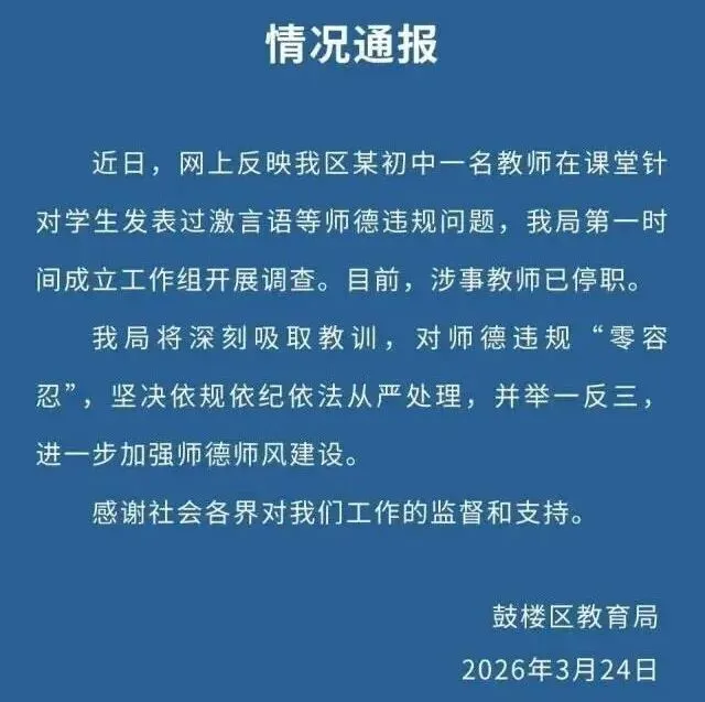 刚刚,南京一名女教师因发表过激言语被停职上了热搜,视频只截取了老师过激的言语,事情真相有待考证。