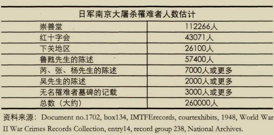 即使怀疑者将太田寿男的供述斥为谎言,人们也应当记住,即使没有他的证言,南京的埋葬记录也提供了令人信服的证据,证明南京大屠杀的死亡人数在20万人以上。孙宅巍的研究与我在远东国际军事法庭的记录中发现的法庭证据(见下表)相吻合。再加上慈善机构估计的埋尸数目(孙宅巍后来的论文中提到过)和其他个人所提供的埋尸统计(孙宅巍的论文中没有提到),远东国际军事法庭的结论是大约26万人在南京大屠杀中被杀害。