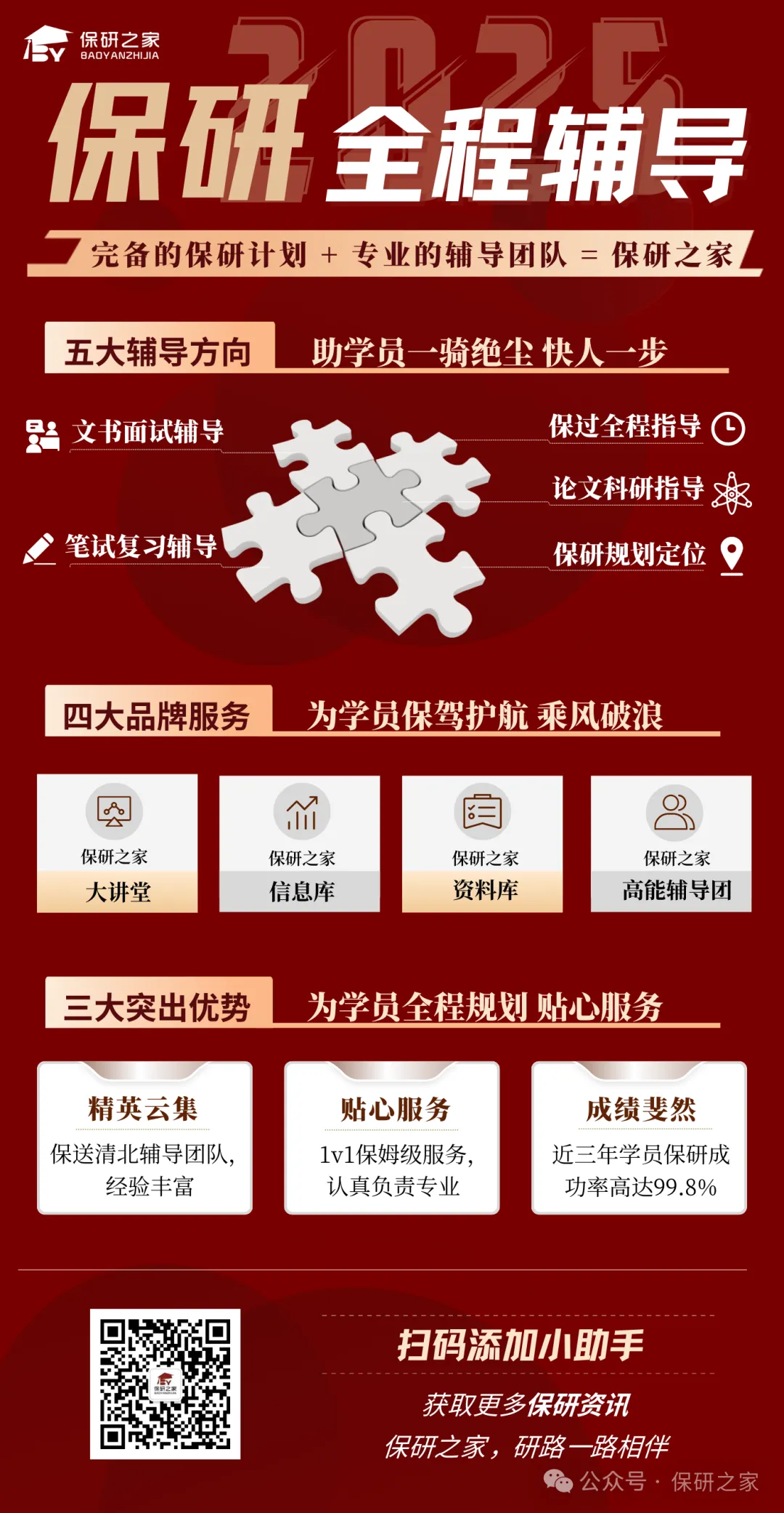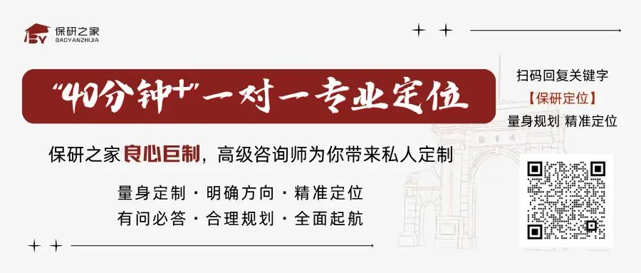 在保研之家,成功的公式为:贴心的服务+靠谱的咨询师团队+ 成熟的教学体系+全面的专业资料库=成功的案例。从保研规划定位、挖掘价值洼地、到论文科研指导、专业笔试辅导、文书面试辅导,保研之家伴你全程,助你一骑绝尘圆梦理想院校!