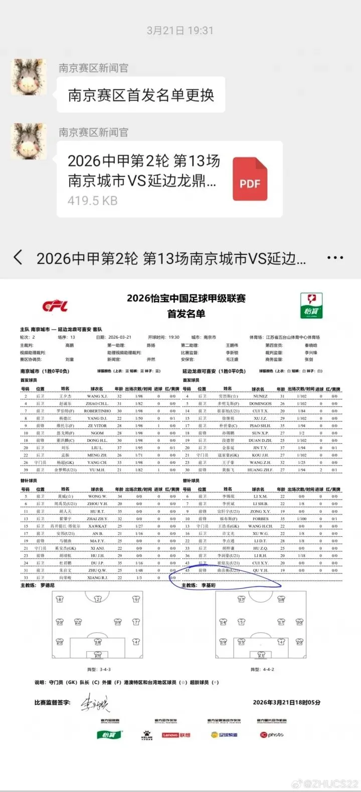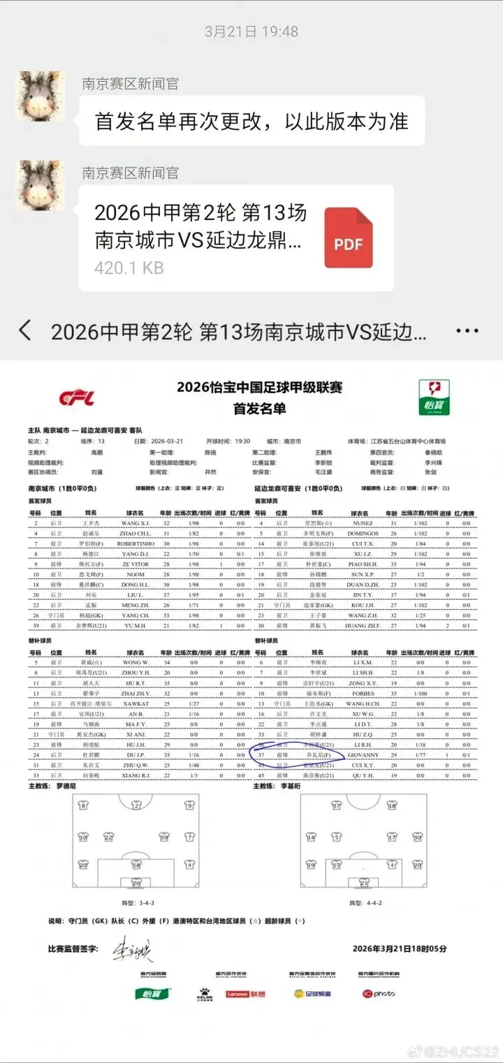 南京城市对阵延边龙鼎的比赛,早在赛前两天,延边队抵达南京赛区时,赛区就提出了公安需要检查外援、外教的相关出入境和工作签证材料,但延边方面一直以“所有外援材料齐全”、“踩场时给到”、“早上联席会给到”、“傍晚到场地时给到”进行拖延,直至赛前,此时,延边已经提交了包括37号乔瓦尼在内的首发名单(附图1-18点32分的第一份首发名单)。在球员进场前,由于延边方面仍未提供相关材料,有关部门再次强调了按照出入境管理处的要求,必须进行材料检查,没有工作类居留许可,不能进行工作,否则将进行行政处罚。于是,在中足联选派的当值比赛监督要求下,延边方面撤下了37号乔瓦尼的首发,将其移出了比赛大名单(附图2-19点31分的第二份首发名单)。之后,上半场开场后,双方仍在斡旋此事,因为球员本身在中足联的竞赛系统中是具备出场资格的,于是在延边方面的要求下,37号乔瓦尼又被报进了替补席。(附图3-19点48分的第三份首发名单)。