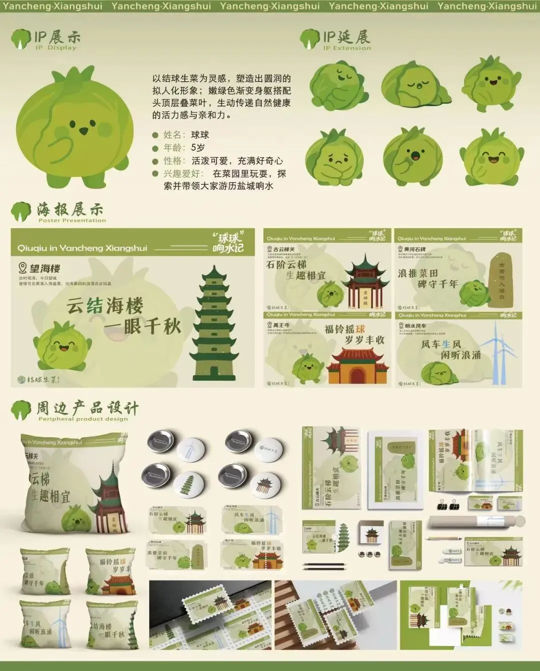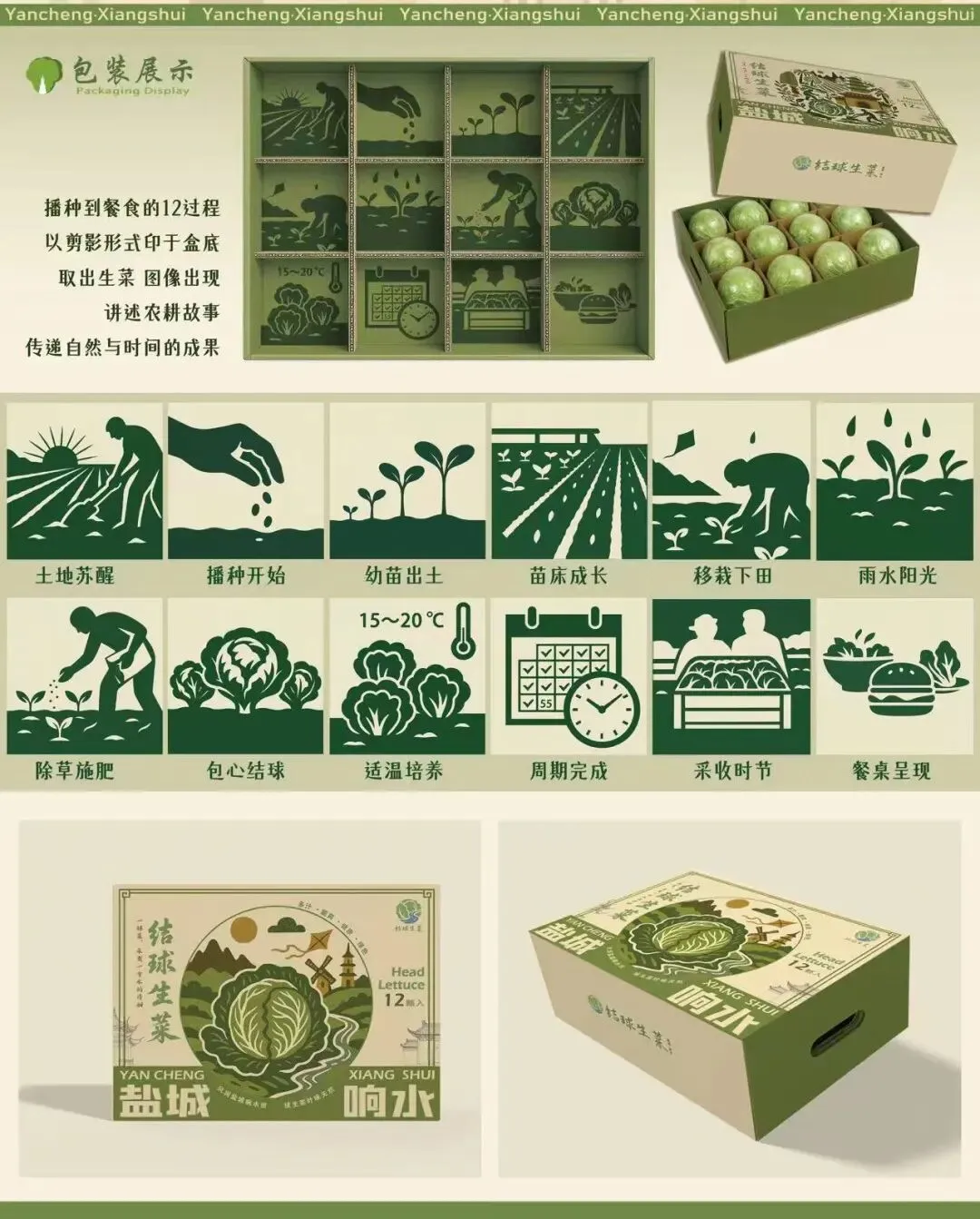 本包装以“结球生菜”为核心,融合绿色种植与响水文化进行视觉演绎。整体采用剪影风格,中心为生菜,环绕望海楼、禹王庙等地域符号,构建产品与文化共生的画面。包装整体采用绿白色调,突出产品清甜脆嫩、生态健康的特性,打造具备传播力与情感价值的农产品包装形象。