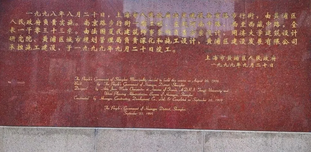 PEPSI 一九九八年八月二十日,上海市人民政府决定建设南京路步行街,由黄浦区人民政府负责实施。南京路步行街一期工程,东起河南中路、西至西藏中路,全长一千零三十三米。由法国夏氏建筑师事务所负责方案设计,同济大学建筑设计研究院、黄浦区城市规划管理局负责深化和施工设计,黄浦区建设发展有限公司承担施工建设,于一九九九年九月二十日竣工。