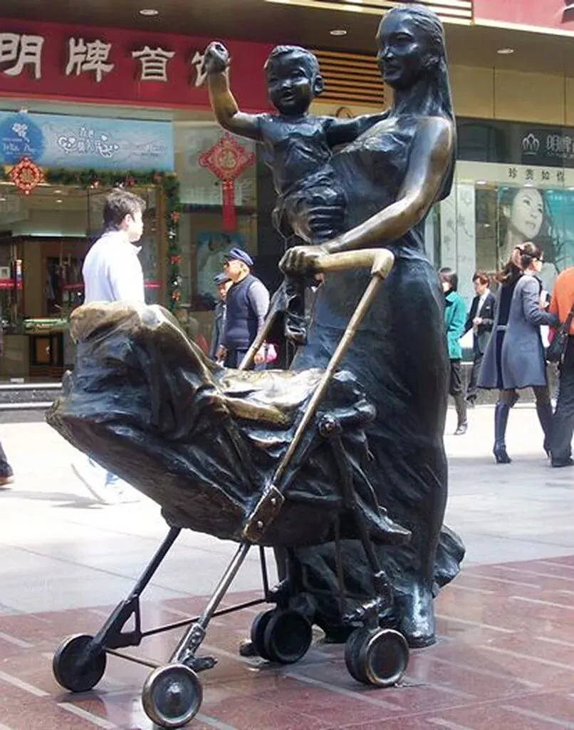• 雕塑内容:年轻母亲一手怀抱婴儿,一手推着装满购物袋的手推车,步履轻快地融入人流,神情从容又充满生活气息。