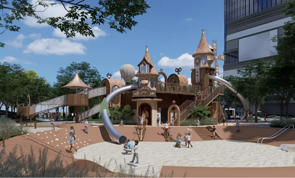 目前,乐园一期示范区已全面开放,奇趣秋千林、巨熊爪痕谷、沙之工坊、星空草坪剧场四大主题区域同步亮相,安全环保的高品质无动力设施,让孩子们在阳光下自由奔跑、探索玩耍。
