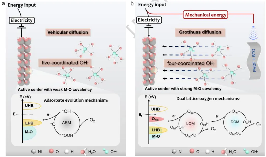 该研究建立了一种通过机械-电化学耦合同时动态优化催化剂电子态和电解液环境的策略,有效克服了析氧反应动力学缓慢的难题。研究表明,短暂的压电极化即可诱导Grotthuss型OH⁻传输状态,通过增加界面OH⁻浓度和削弱O-H键,促进NiOOH的原位电子重构,增强Ni-O共价性,从而激活双晶格氧介导的低能垒反应路径。这一脉冲式能量输入策略仅需1分钟超声波处理即可实现222 mV的过电位降低,显著优于连续能量输入方案,为多能量耦合水电解提供了高效且可规模化的技术路径。更重要的是,该策略允许在外部压电处理模块中对电解液进行预极化,随后在主体电解槽中进行电解,这种空间解耦的能量耦合构型从根本上解决了多能量输入系统中时空控制困难的核心问题。该模块化设计不仅克服了实际应用的关键限制,还为先进能源转换技术的多能量增强策略提供了可扩展的实用方案,对推动绿氢制备技术的工业化应用具有重要意义。