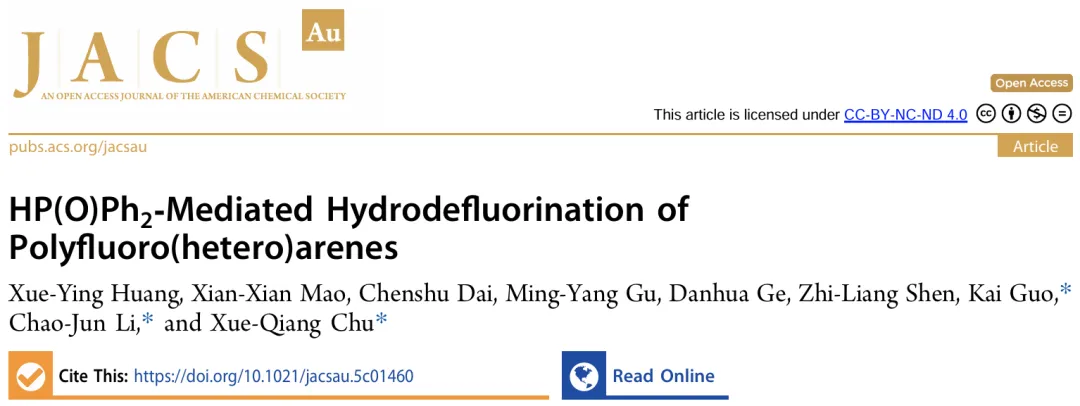 Xue-Ying Huang, Xian-Xian Mao, Chenshu Dai, Ming-Yang Gu, Danhua Ge, Zhi-Liang Shen, Kai Guo, Chao-Jun Li, and Xue-Qiang Chu.HP(O)Ph₂-Mediated Hydrodefluorination of Polyfluoro(hetero)arenes. JACS Au, 2026, 10.1021/jacsau.5c01460