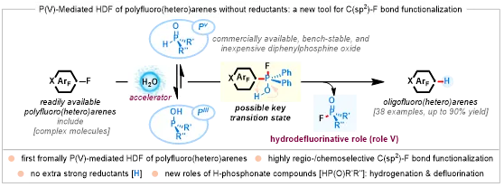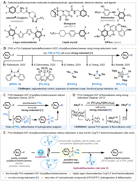 图1.多氟芳烃分子的重要性及P(I/III/V)介导的多氟(杂)芳烃脱氟氢化反应(图源:ACS Au)