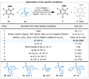 作者以2,3,4,5,6-五氟-4'-甲氧基-1,1'-联苯(1a)为模型底物,在二苯基氧膦(2a,1.5当量)、水(5当量)和碳酸铯(3当量)存在下,于二甲亚砜中100 ℃反应12小时,进行脱氟氢化反应研究。令人满意的是,目标产物3的核磁收率达到83%,原料1a剩余11%(Entry 1)。值得注意的是,将溶剂换为乙酸乙酯、乙腈、甲苯、四氢呋喃、甲醇、DMA或水均导致产率显著下降(Entry 2)。此外,对不同碱(如乙酸钠、磷酸钾、三乙胺、氢氧化锂和DABCO)的筛选表明(Entry 3),碳酸铯仍是最优选择。当反应温度升至125 ℃时,产物3的核磁收率提高至93%(分离收率90%),且未生成过度脱氟产物(Entry 4);而将温度降至75 ℃时,产物核磁收率为77%,原料剩余15%(Entry 5)。随后,使用不同取代基的H-磷酰化合物包括二对甲苯基氧膦2b、双(4-氟苯基)氧膦2c、亚膦酸二乙酯2d和苯基次膦酸乙酯2e)替代2a进行反应,结果显示其反应活性均有所下降(Entry 6),这归因于不同磷亲核试剂的P(=O)H→P-OH互变异构速率存在显著差异[HP(O)Ph₂>HP(O)Ph(OEt)> HP(O)(OEt)₂]。正如预期,不含H–P键的三苯基氧膦2f未能生成任何产物。对照实验进一步证实H-磷酰化合物(Entry 7)与碳酸铯(Entry 8)在反应中不可或缺。未加水(Entry 9)或缩短反应时间(Entry 10)对脱氟效果影响有限,且所有条件下直接脱氟磷酰化副产物3'的核磁收率均低于5%。