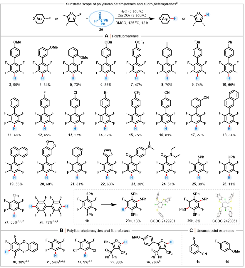 首先,作者对一系列多氟芳烃的底物适用性进行了研究(图4,A)。带有供电子基团(产物3-9)、吸电子基团(产物12-17)[如醚基(产物3-7)、卤素(产物12-14)、三氟甲基(产物15)和氰基(产物16-17)]以及杂芳环结构[如苯并[d][1,3]二氧杂环戊烷(产物20)、吡啶(产物21)和噻吩(产物22)]的底物均可顺利实现脱氟氢化,以良好至优异收率得到相应产物。多环芳烃产物10、18和19的收率为56-84%。带有酰胺基(产物23-24)、硫醚基(产物25)和醚基(产物26)的底物,在该反应体系中均能兼容,为进一步的官能团化预留了操作空间。值得注意的是,全氟甲苯能顺利以55%的收率生成产物27,且其三氟甲基的C(sp³)–F键不会参与反应。当使用两倍量的H-P(O)Ph₂和碳酸铯时,全氟-1,1'-联苯(产物28)选择性地实现了对位两个C−F键的脱氟氢化。而使用(全氟-1,4-亚苯基)双(苯硫醚)(1b)时,则意外生成了脱氟重构芳烃产物29a和29b,其相关结构已通过X射线晶体学分析确定。