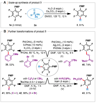 随后,作者将该反应放大至3 mmol规模,以91%的分离收率获得产物3,未出现明显的效率与选择性下降,展现出优异的可放大性(图6,A)。如图6,B所示,所得产物3可作为通用合成砌块,进一步转化为一系列结构多样的氟代芳烃衍生物。在钯催化或碱性条件下,通过芳基化、烯基化、碘化、溴化及膦酸化等转化,分别以51-99%的产率得到化合物39-43。值得注意的是,上述转化过程均未使芳环中其他C(sp²)–F键断裂,保证了其结构完整性。