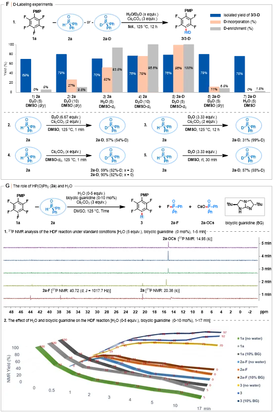 与此同时,作者无法排除磷酰基阴离子(A)介导的A-T型脱氟可能性,该路径首先生成芳基阴离子E,随后阴离子被水或二甲亚砜快速质子化释放HDF产物(路径B)。此外,由1a对P(III)OH化合物2a'氧化加成生成P(V)OH中间体G(路径C),其经分子内质子转移可进一步生成F-P(O)Ph₂(2a-F)与HDF产物。