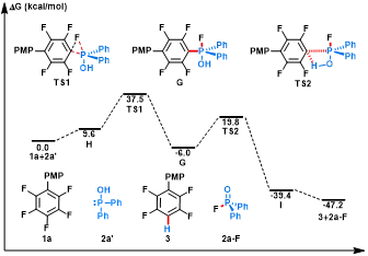 为深入理解HP(O)Ph₂介导的脱氟氢化过程,作者采用密度泛函理论(DFT)对可能的反应路径进行了研究。计算结果表明,反应活性物种P(III)-OH中间体2a'首先对多氟芳烃1a中的C(sp²)–F键进行氧化加成,经由过渡态TS1(ΔG‡ = 37.5 kcal/mol)生成五价P(V)-OH中间体G。随后,中间体G通过四元环过渡态TS2(ΔG‡ = 19.8 kcal/mol)发生分子内质子转移,最终生成目标脱氟氢化产物3。该计算所揭示的分步反应机制,与哈米特研究得出的结论相吻合。