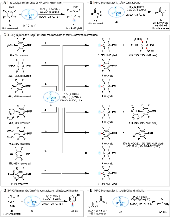 值得注意的是,H-P(O)Ph₂的键活化能力并不局限于C(sp²)–S键,其同样适用于C(sp²)–P键的裂解,而此类过程在传统方法中往往需要过渡金属的参与(图11,C,式7)。但当前体系对多氟芳烃化合物46b-46f中的C–O/N/C键(图11,C,式26)、杂环48中的C(sp²)–S键(图11,D)以及酮类化合物50-51中的C(sp²)–Br/Cl键(图11,E)均未表现出反应活性。