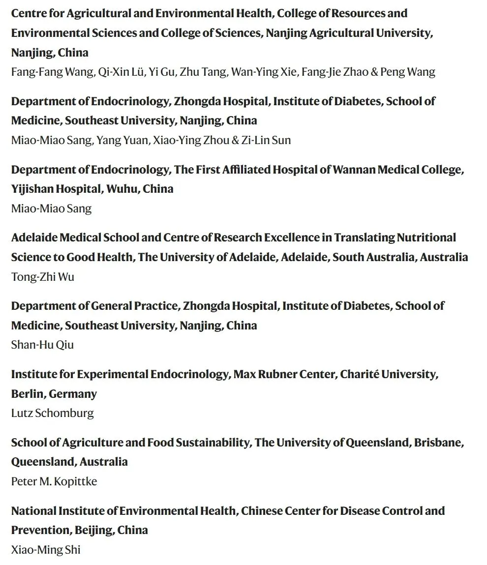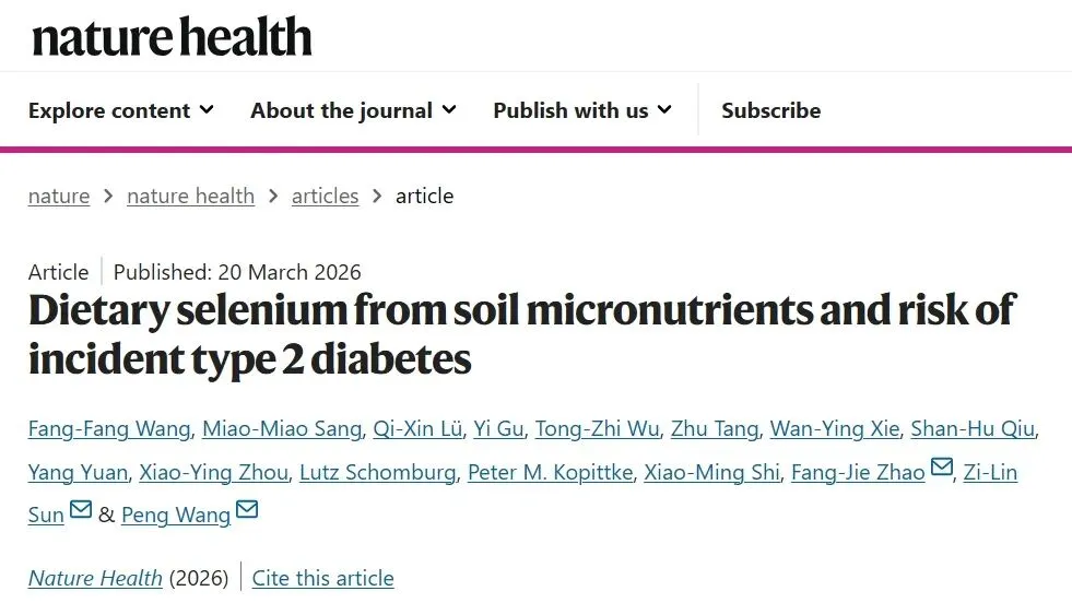 近日,国际顶级期刊《Nature》子刊(Nature Health)刊发了由南京农业大学、东南大学、阿德莱德大学、夏里特大学、昆士兰大学及其相关科研研究所、实验室等16位学者联合发表的论文:Dietary selenium from soil micronutrients and risk of incident type 2 diabetes.