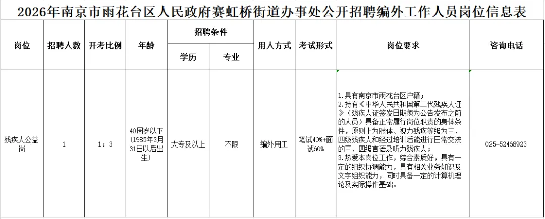 因业务需要,按照“公开、平等、竞争、择优”的原则,南京市雨花台区赛虹桥街道办事处现面向社会公开招聘编外工作人员1名,从事相关工作。现将有关事项公告如下: