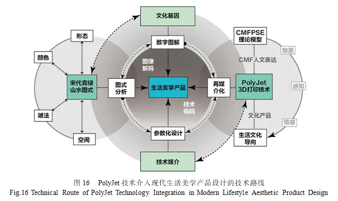 摘要:目的 随着科技的不断进步,3D打印技术正在迅速改变传统制造业的面貌,日益融入经济社会发展各领域全过程,深刻改变着生产模式和生活方式。本文旨在通过对宋代青绿山水这种具有全球传播力的文化IP图式研究,尝试将古代画卷与当代算法和数字制造工艺形成跨时空链接,探寻数智时代中华优秀传统文化介入生活美学产品的创新设计方法。方法 引入产品CMF设计CMFPSE理论模型,对宋代青绿山水形态、颜色、皴法与空间4个方面进行图式分析与数字编码,提供一种“文化基因→数字图解→技术媒介→CMF人文表达→生活美学产品”的设计思路。结果 借助参数化设计和PolyJet技术的“再媒介”,激活文化遗产,提升CMF材料的情感价值,彰显新时代人文价值的回归、技术与文化双轴驱动的发展精髓。结论 以PolyJet为代表的新兴技术与文化共生,为文化产业注入持续的创新动能提供了一个全新的视角和实践参考。