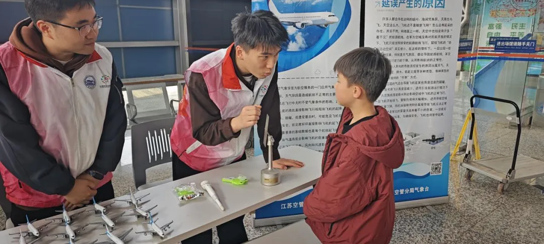 活动特别设置民航气象小课堂专区,由江苏空管分局气象台带来专业科普内容。现场展示真实气象设备,科普志愿者细致讲解气象对飞机起降、飞行安全的关键影响,通过“看图识天气”“指挥飞机降落”“民航设备识别”等互动游戏,让孩子们直观了解空管气象人的工作日常。参与者还可领取专属科普手册与纪念礼品,深刻感受每一次平安飞行背后的气象守护力量,将专业气象知识与民航安全知识有机融合。
