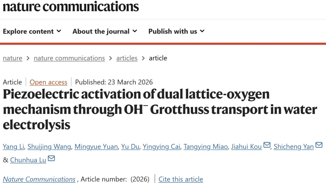 通过向压电复合材料(PVDF/BaTiO₃)施加短时超声脉冲,产生强局域电场,同步优化催化剂电子态与电解质环境。该电场一方面诱导Grotthuss型OH⁻传输,富集界面OH⁻并削弱O-H键;另一方面驱动NiOOH催化剂原位电子重构,增强Ni-O共价性。这种协同作用将OER路径从传统的吸附演化机制转向更高效的双晶格氧介导路径(Olat-*O耦合与Olat-Olat耦合),从而在仅一分钟超声刺激后,于100 mA cm⁻²下实现了222 mV的低过电位。