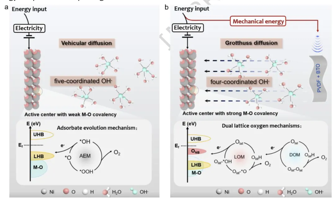 a 传统电力驱动水电解通常遵循吸附物演化机制(AEM),依赖OH−离子的载体扩散。UHB 和 LHB 分别代表上 Hubbard 带和下 Hubbard 带。b 与之相对,力 - 电化学耦合水电解利用机械能产生的压电电场,使OH−通过Grotthuss 机制传输。这增强了金属 - 氧(M-O)键的共价性,并将氧析出反应(OER)路径从 AEM 转向低能垒的双晶格氧机制,包括晶格氧机制(LOM)和双原子氧机制(DOM)。ONB代表氧非成键态,Olatt代表晶格氧。
