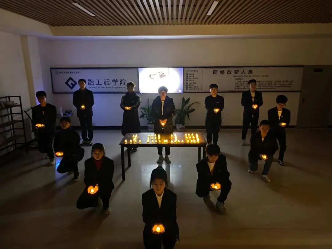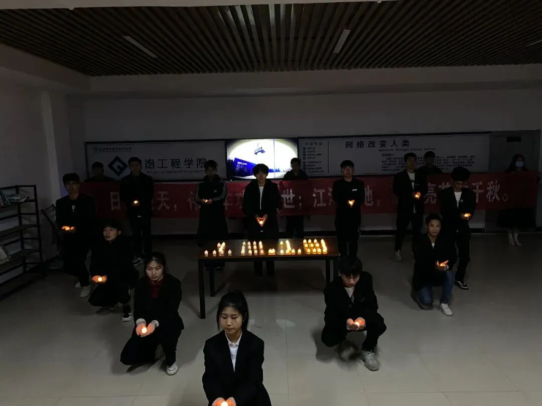 晚上二十时整,于网络工程学院大厅举行点燃烛光缅怀逝者活动,学生会全体成员进行庄重宣誓,勿忘国耻,誓要振兴中华!