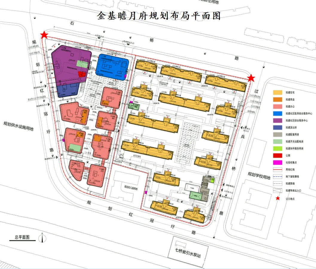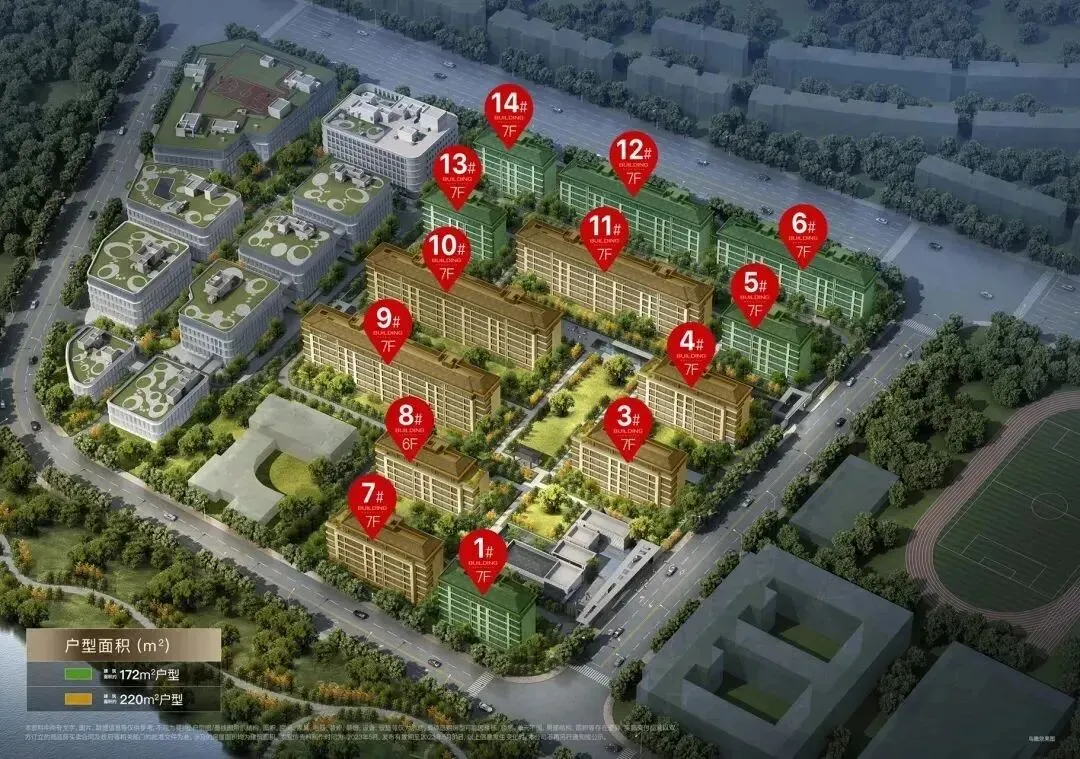 根据规划显示,项目将拟建13栋6-7F低密洋房住宅,7栋商办楼,1栋社区综合服务中心和1栋社区医养结合服务中心,以及一所幼儿园。