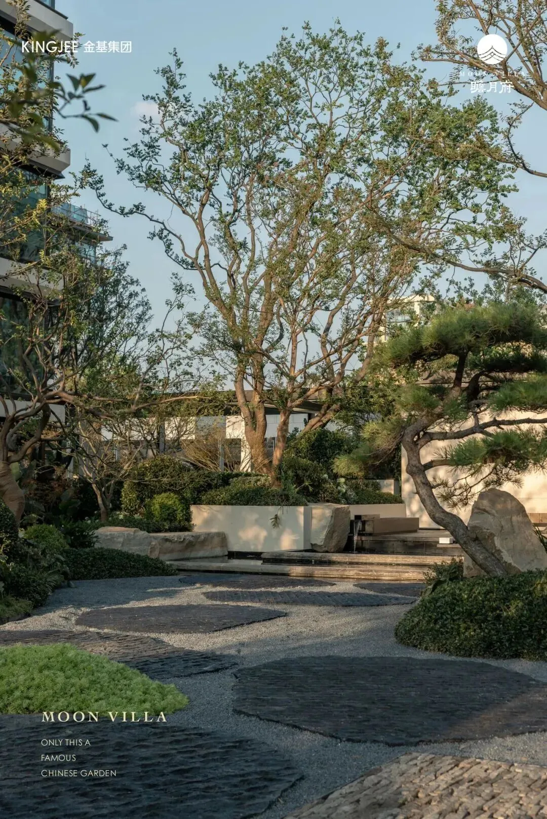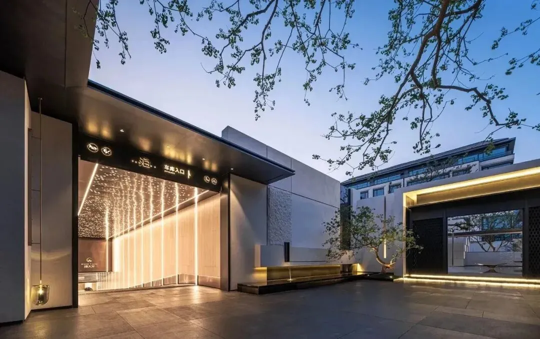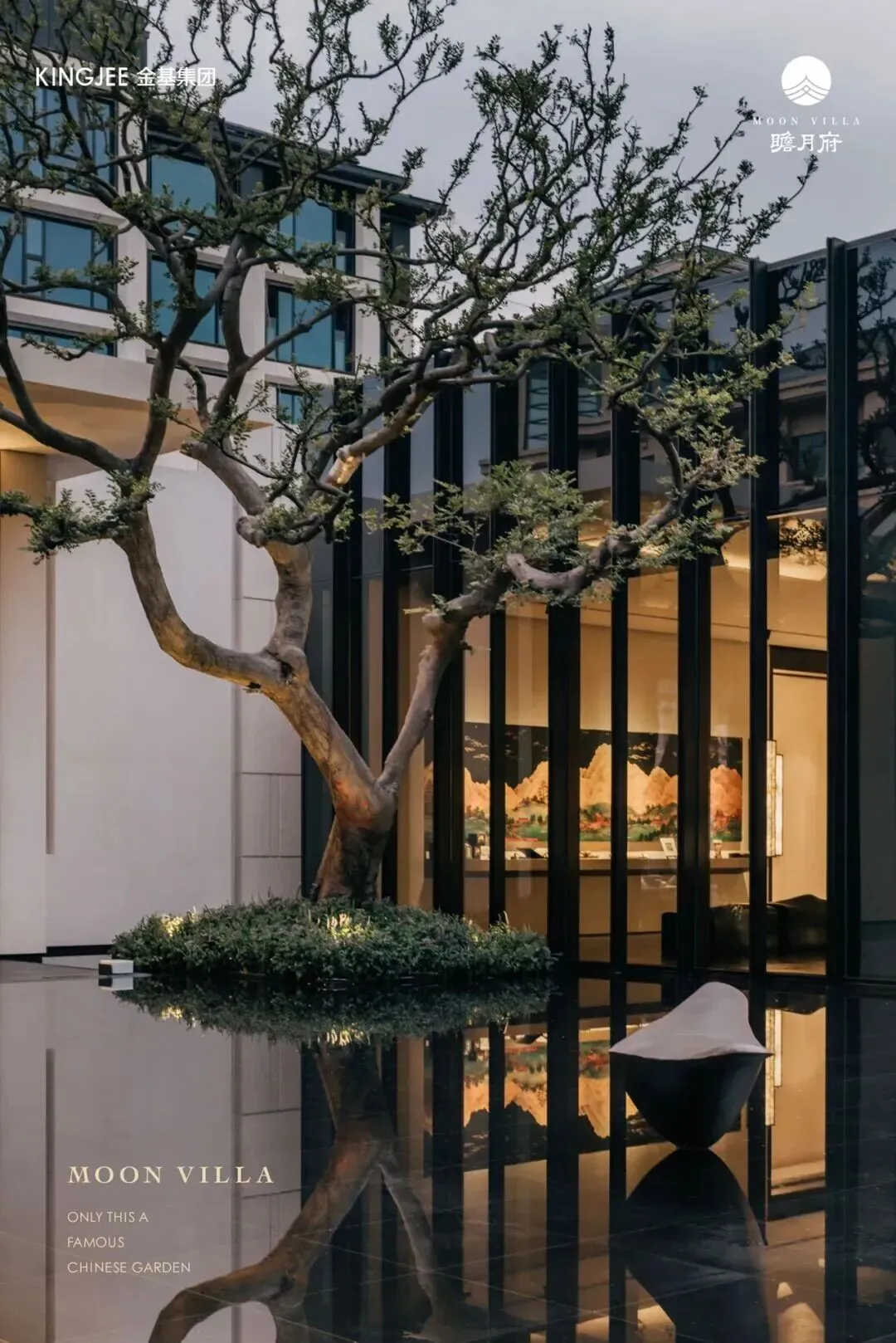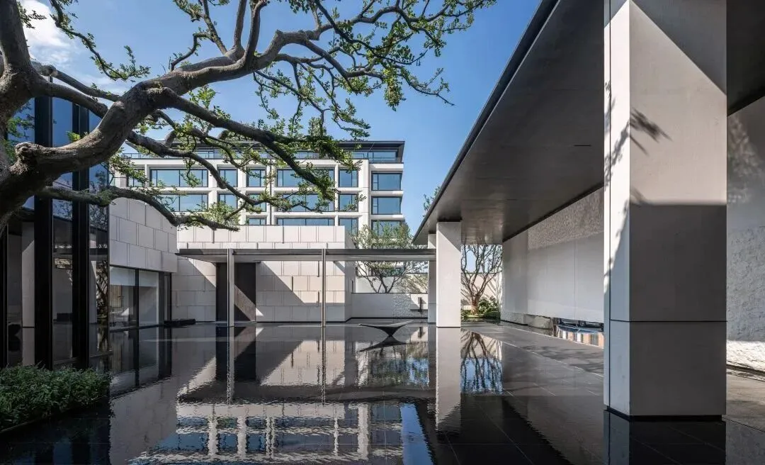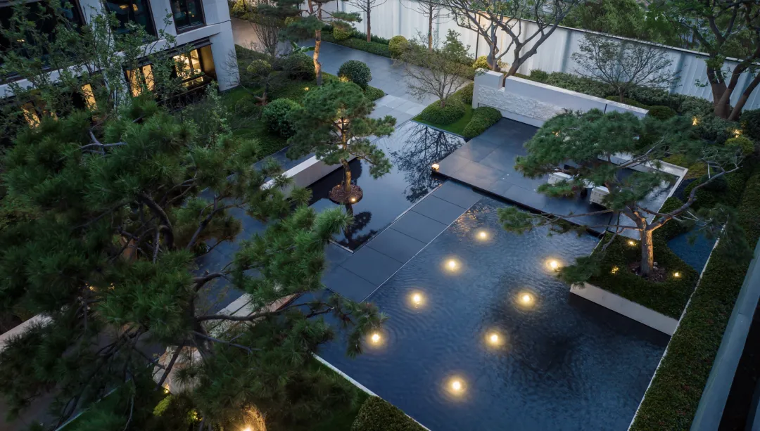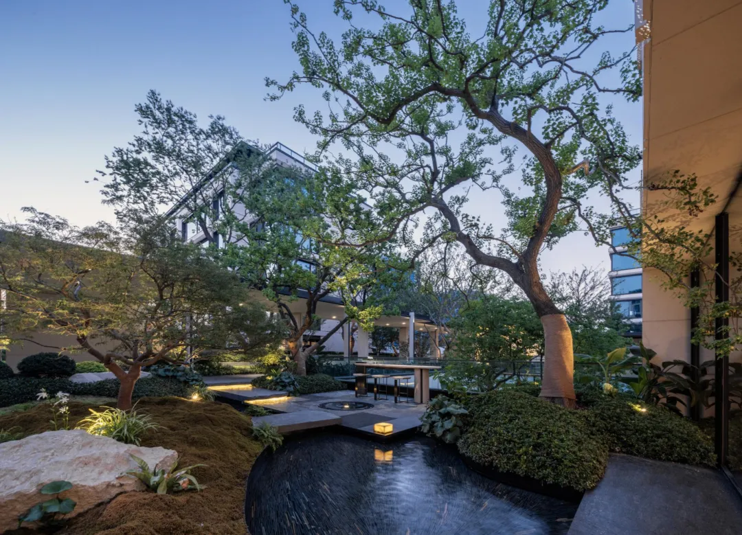 穿过大门,两棵造型绝美的乌桕,搭配高山流水,精致到极致,寓意也很喜人,开门见水,遇水生财。