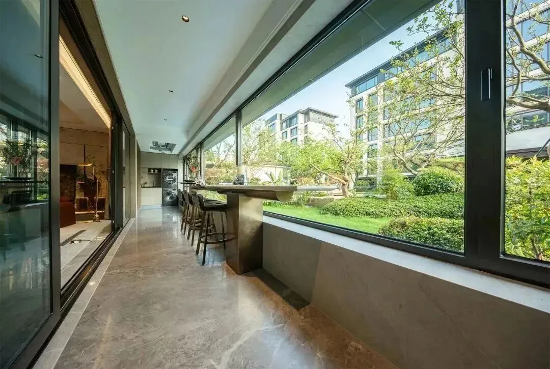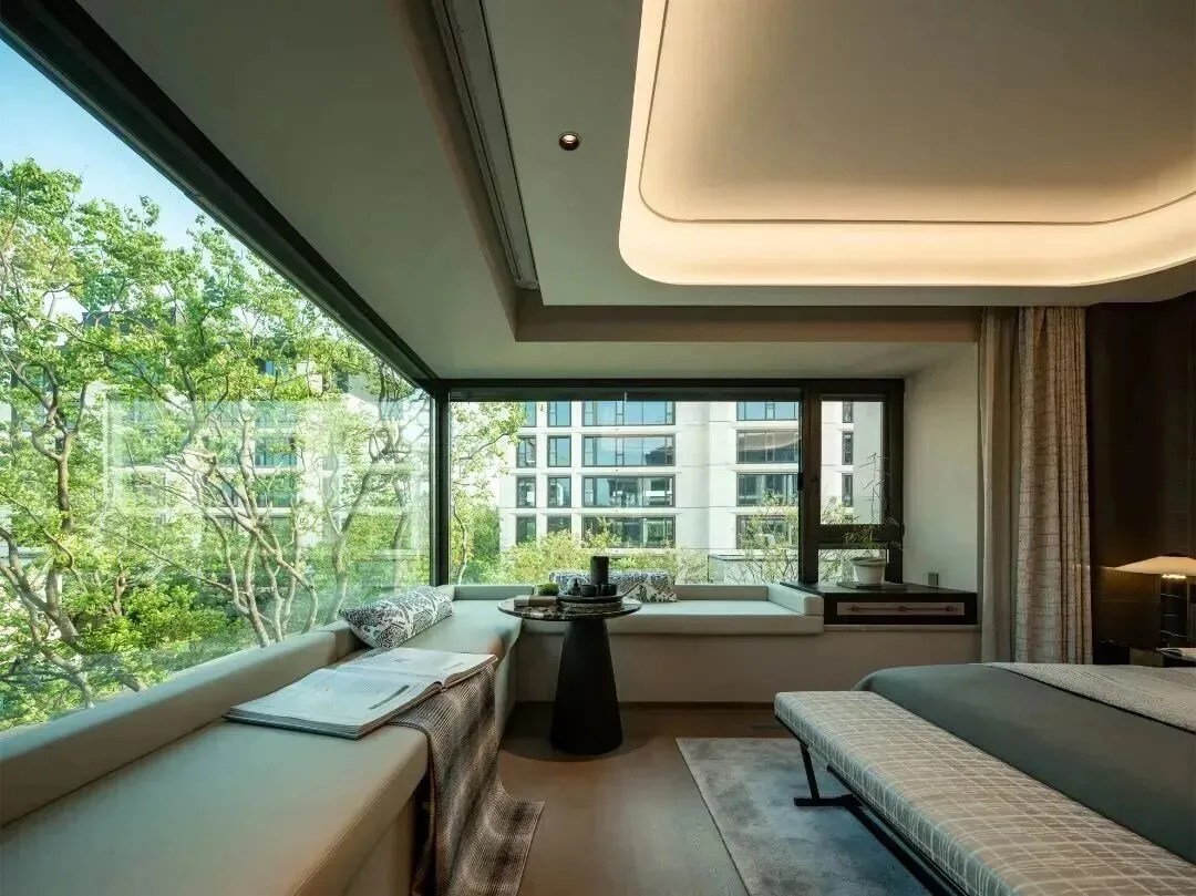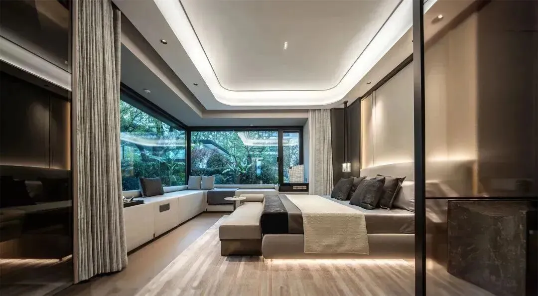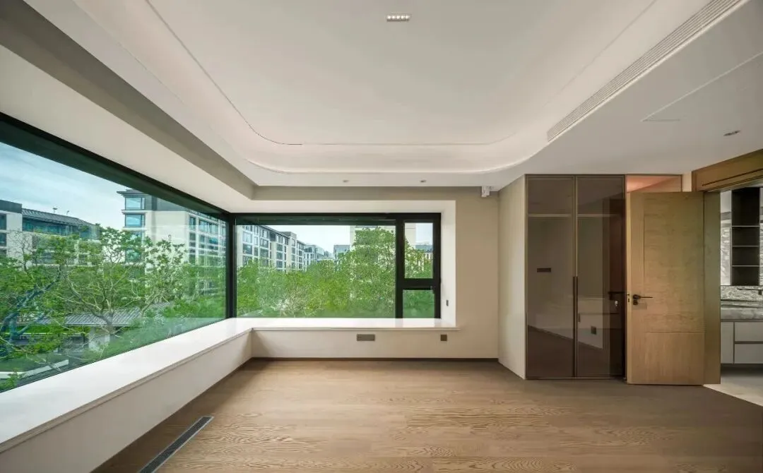 进口的干挂石材立面,超大面全景落地窗,主卧还是270°转角玻璃窗。