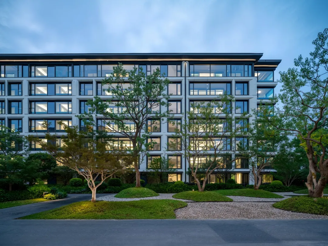大面积的镜面水景,大片松树、朴树、乌桕等树种和各种石材共同构建的园林景观。