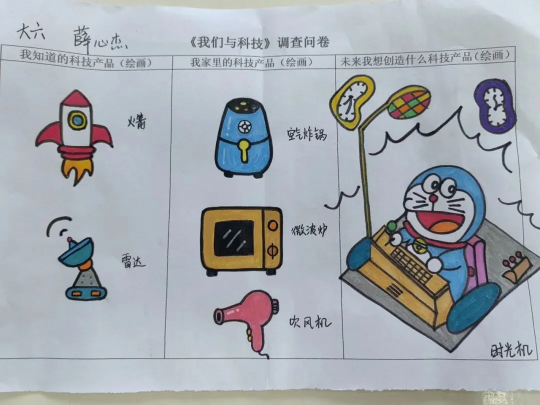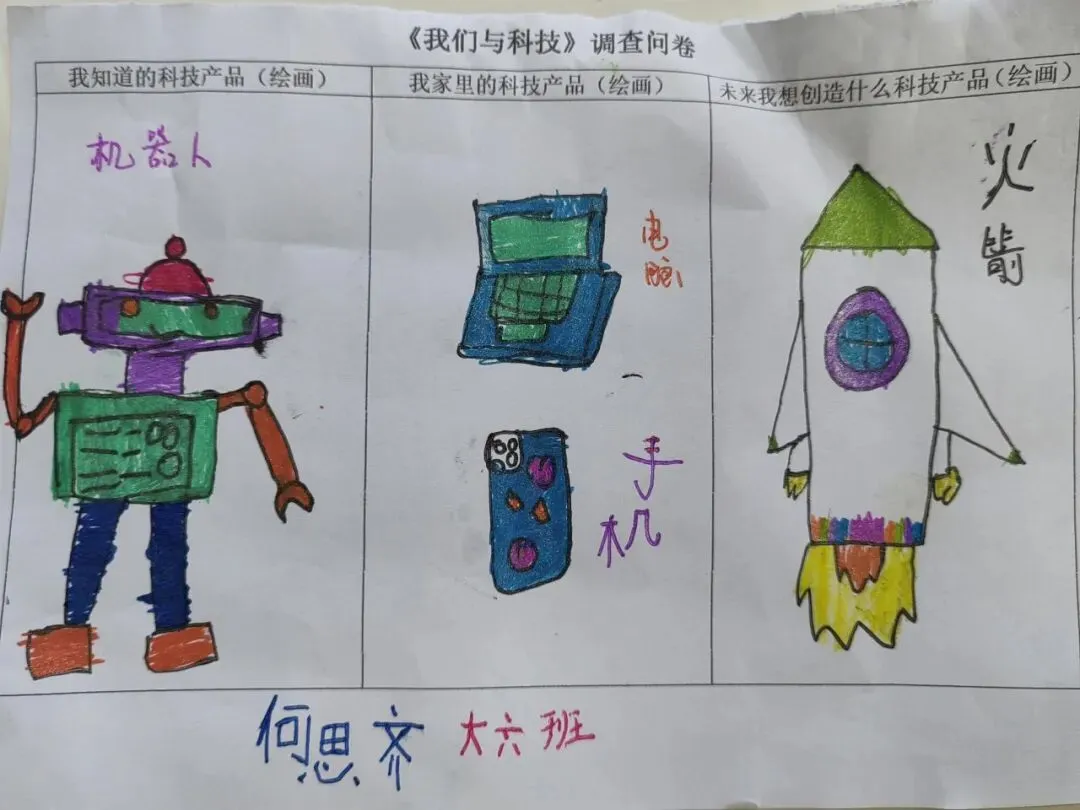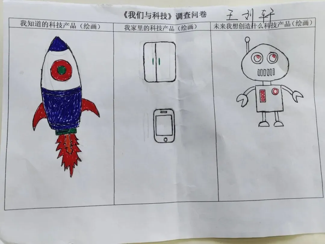 孩子们通过问卷调查的方式用绘画“表述”出了自己知道的以及身边已有的科技产品,也绘画出自己未来想创造的科技产品。
