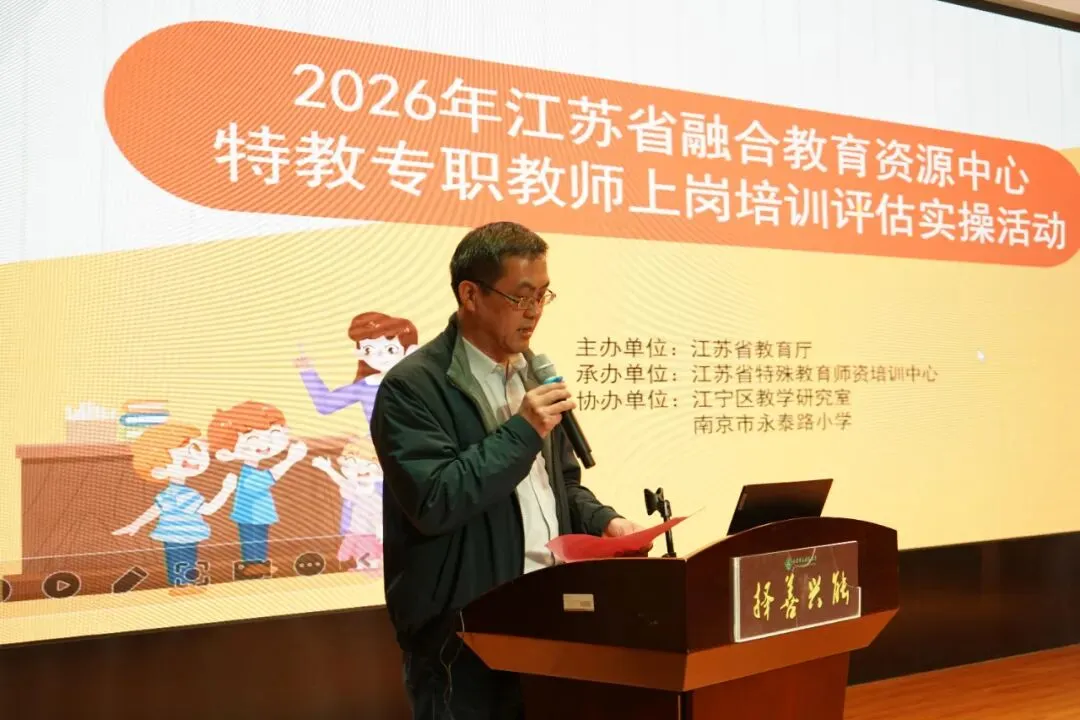大爱融心,教泽绵长;融育于行,无碍花开。3月23日下午,江苏省融合教育资源中心特教专职教师上岗培训学业水平评估实践活动在南京市永泰路小学顺利举行。来自江苏省特殊教育师资培训中心、南京特殊教育师范学院的专家及全体培训学员共同参与此次活动。南京特殊教育师范学院王辉教授、江苏省特殊教育师资培训中心杨少波科长、江宁区教学研究室刁一建主任、茅成老师及南京市永泰路小学朱群校长出席本次活动。