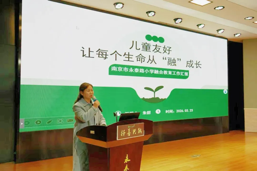 随后,南京市永泰路小学朱群校长以《儿童友好,让每个生命从“融”生长》为题作学校融合教育工作汇报。她从厚植友善共育理念、营造全纳多元场域、融活适性成长举措三方面,系统介绍了学校自2021年以来推进融合教育的实践探索与经验成果。