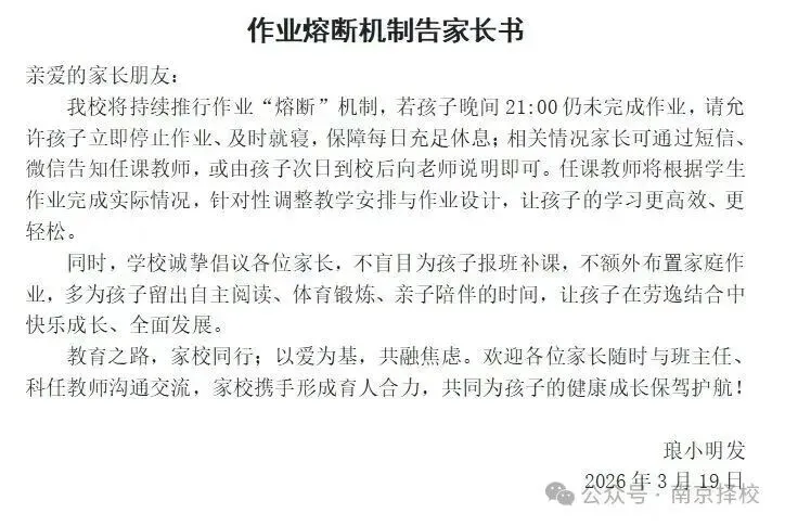 近日,南京的家长群里又被一则“作业熔断机制”的通知刷屏了。