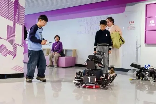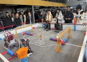 在VEX VRC赛场(小型模拟场)上,各小组轮流尝试用遥控器控制机器人,完成预设的任务。