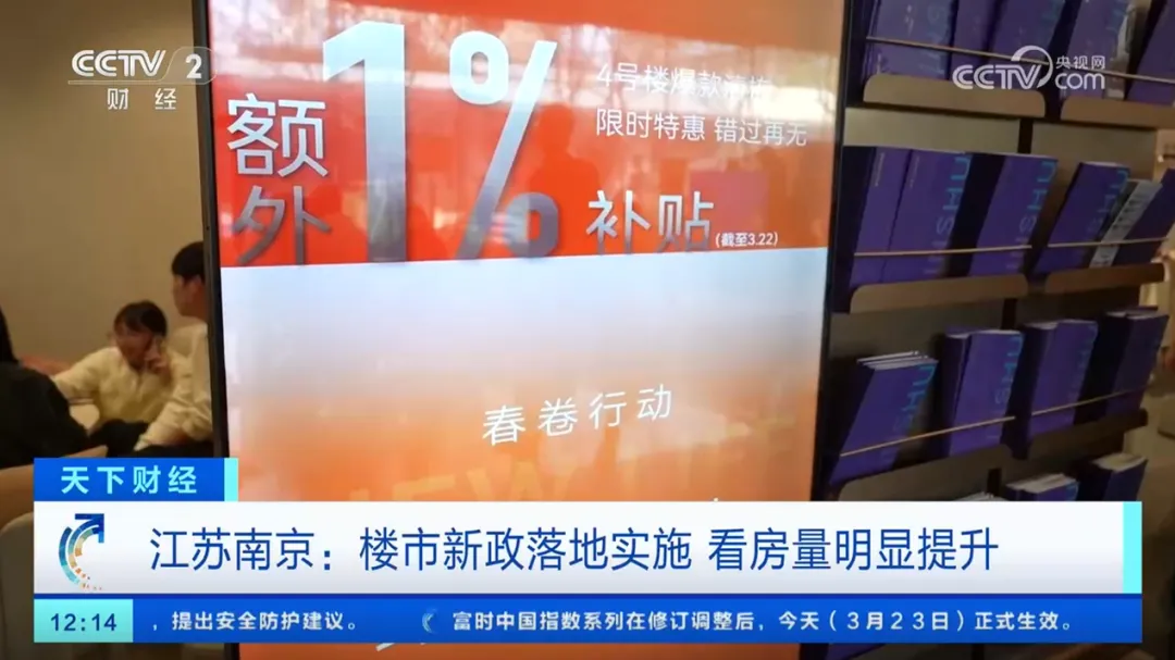 3月23日,CCTV财经频道《天下财经》播出《江苏南京:楼市新政落地实施 看房量明显提升》新闻,首个出镜项目即为联发雨花新澍,镜头下售楼处人流如织,置业热情高涨。