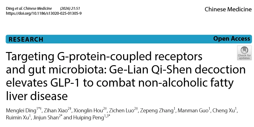 为探究葛连启神汤(GQD)改善非酒精性脂肪肝(NAFLD)的机制,先构建高脂饮食诱导的 C57BL/6J 小鼠 NAFLD 模型,经不同剂量 GQD 干预后,通过生化、病理及糖耐量实验验证其对 NAFLD 的改善作用;再利用细胞实验、分子实验明确 GQD 激活肠道内分泌细胞苦味受体和 TGR5 等 G 蛋白偶联受体(GPCR)、促进 GLP-1 分泌的直接作用及关键活性成分;随后通过 16S rDNA 测序、代谢组学分析 GQD 对小鼠肠道菌群及短链脂肪酸(SCFAs)的调控作用,并结合粪菌移植实验验证肠道菌群的介导作用;最终证实 GQD 可通过活性成分直接激活 GPCR 促进 GLP-1 分泌,同时调控肠道菌群升高 SCFAs、上调结肠 Gcg 基因表达实现 GLP-1 持续升高,双重途径协同改善 NAFLD 相关症状。
