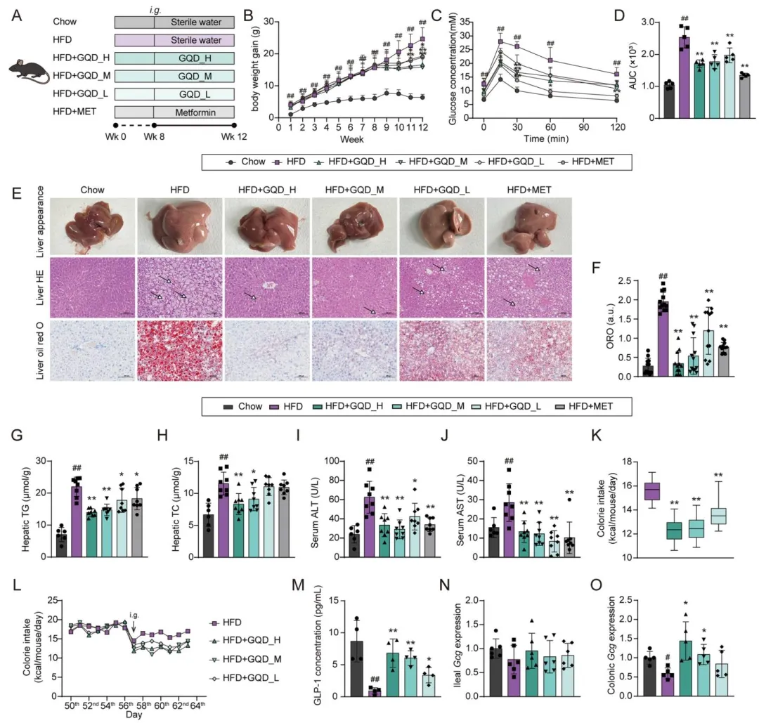 Fig1:验证 4 周不同剂量 GQD 干预可改善高脂饮食小鼠的体重增加、糖耐量异常,减轻肝脂肪变性、降低肝脂和血清转氨酶水平,减少小鼠每日热量摄入,同时剂量依赖性升高血清 GLP-1 水平、上调结肠 Gcg 基因表达,证实 GQD 对 NAFLD 的改善作用与 GLP-1 相关。