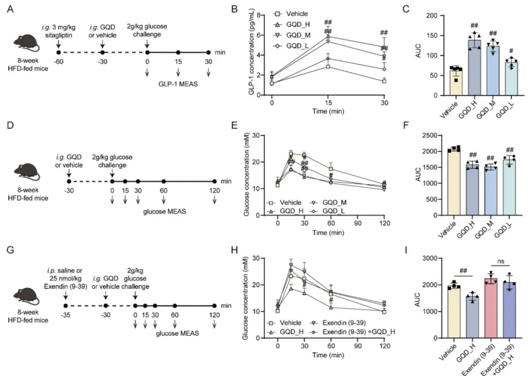 Fig2:证实单次给予 GQD 可直接升高高脂饮食小鼠血清 GLP-1 水平,且呈剂量依赖性改善小鼠糖耐量,而 GLP1R 抑制剂可逆转 GQD 改善糖耐量的作用,说明 GQD 对糖代谢的改善依赖于 GLP-1 通路。