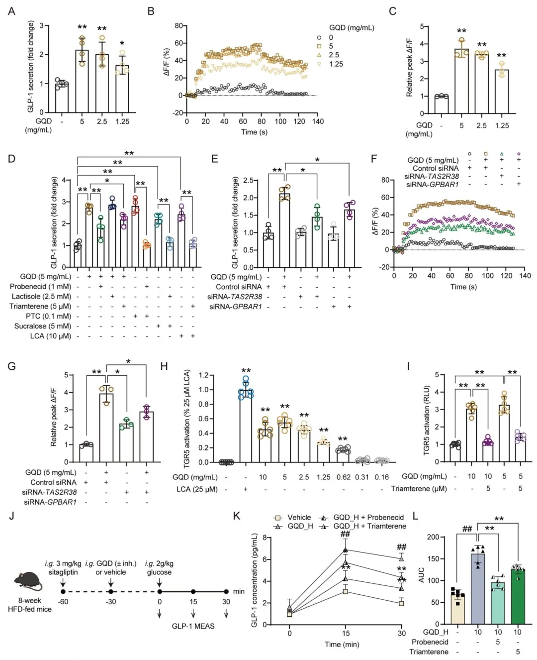 Fig3:证实 GQD 可促进 NCI-H716 细胞钙内流和 GLP-1 分泌,苦味受体抑制剂、TGR5 抑制剂及对应的基因敲低可阻断该作用,GQD 可直接激活 TGR5,且两种抑制剂能减弱 GQD 在小鼠体内的促 GLP-1 分泌作用,明确 GQD 通过激活苦味受体和 TGR5 促进 GLP-1 分泌。