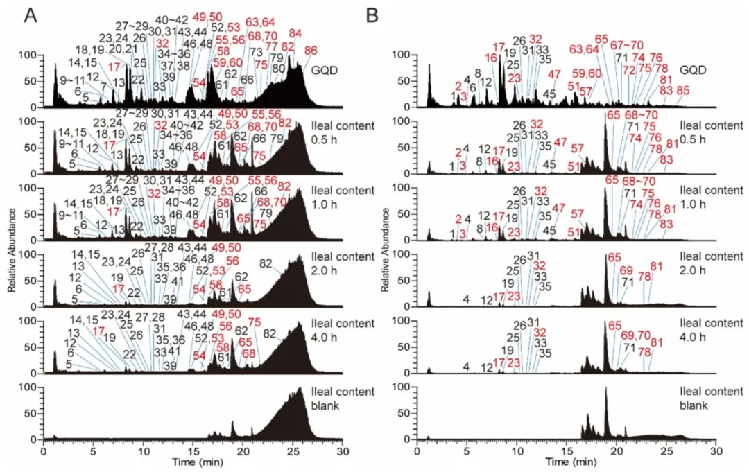 Fig4:通过 UPLC-MS/MS 获得 GQD 及灌胃后小鼠回肠内容物在正负离子模式下的化学图谱,直观展示 GQD 的化学成分及经胃肠道后在回肠的分布特征,为筛选活性成分提供基础。