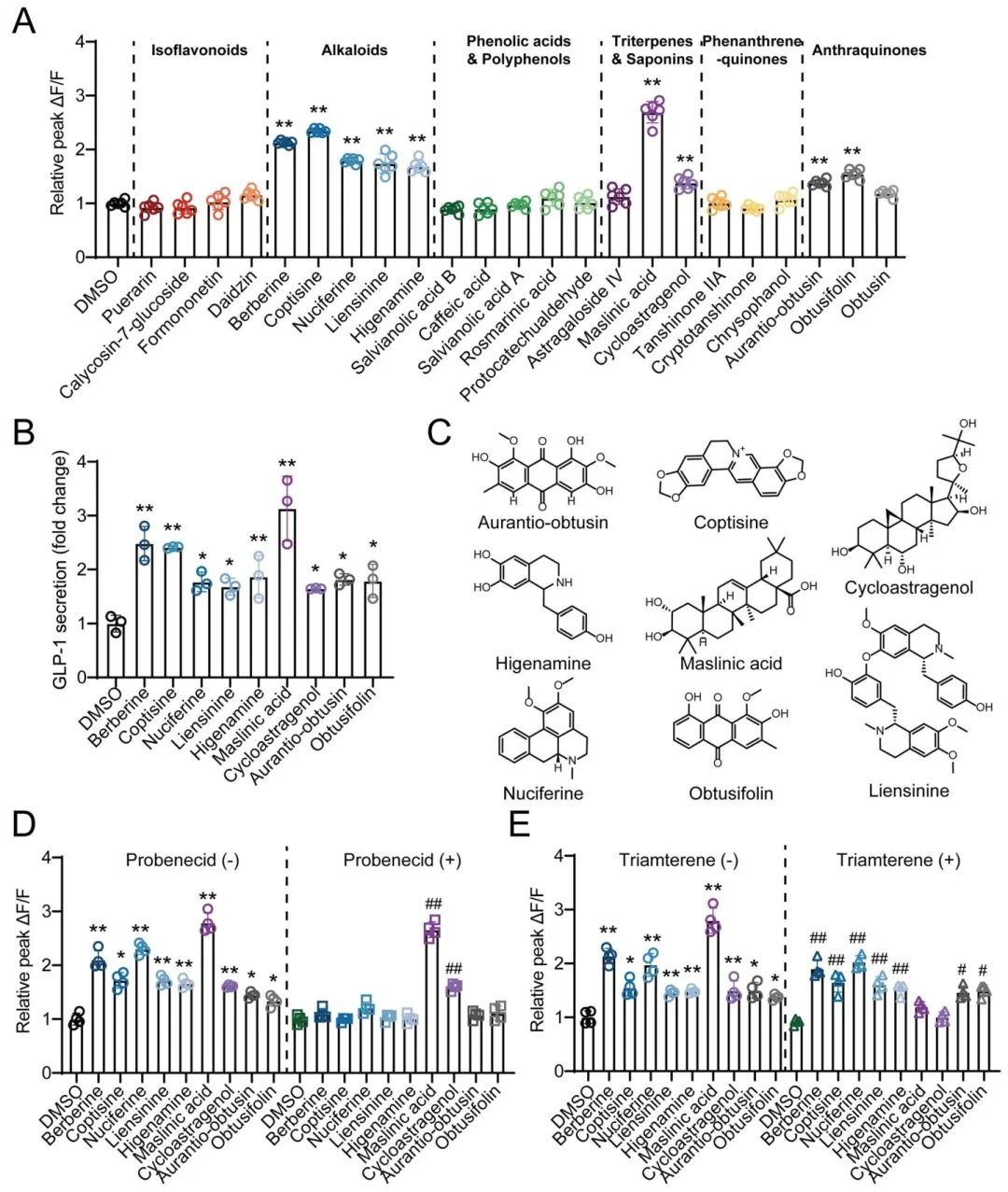 Fig5:筛选出 GQD 中可促进 NCI-H716 细胞钙内流和 GLP-1 分泌的关键活性成分,证实生物碱 / 蒽醌类的作用依赖苦味受体、三萜类的作用依赖 TGR5,明确 GQD 促 GLP-1 分泌的物质基础。