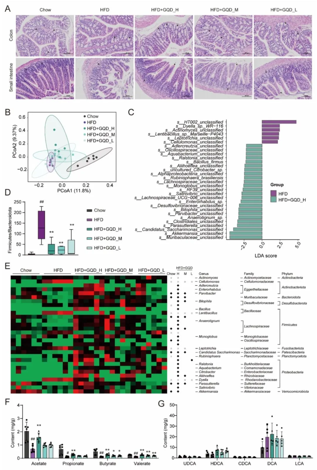 Fig6:证实 GQD 可改善高脂饮食小鼠肠道组织形态,逆转肠道菌群失调、降低厚壁菌门 / 拟杆菌门比值,升高 Muribaculaceae 和 Akkermansia 等有益菌丰度,显著增加结肠 SCFAs 含量,对胆汁酸水平无明显影响,揭示 GQD 对肠道菌群及代谢物的调控作用。