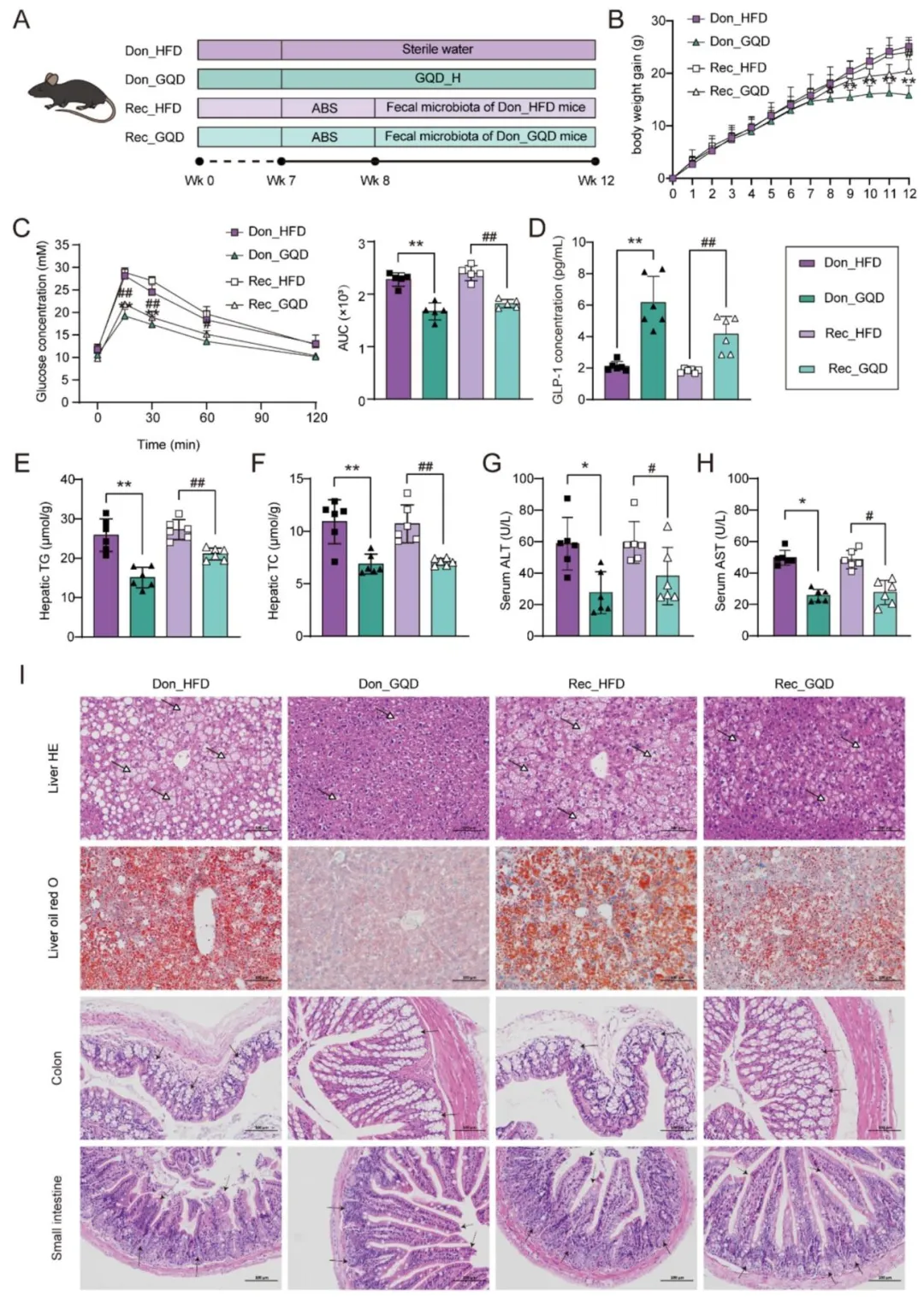 Fig7:粪菌移植实验证实,移植 GQD 处理小鼠的粪菌可减轻高脂饮食受体小鼠的体重增加、改善胰岛素抵抗,升高血清 GLP-1 水平,减少肝脂肪堆积、降低血清转氨酶,同时改善肠道组织形态,证明肠道菌群部分介导 GQD 的抗 NAFLD 作用。