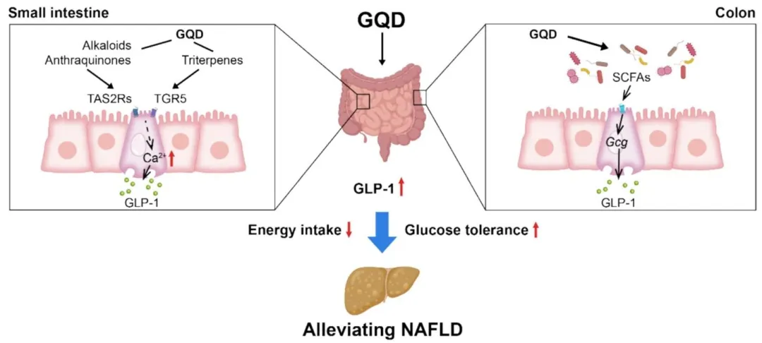 GQD 呈剂量依赖性改善高脂饮食小鼠肝脂肪变性、糖耐量异常和血脂升高,减少能量摄入,升高血清 GLP-1 水平并上调结肠 Gcg 基因表达;GQD 可激活肠道内分泌细胞的苦味受体和 TGR5,促进细胞内钙内流进而刺激 GLP-1 分泌,小檗碱、莲心碱等生物碱 / 蒽醌类激活苦味受体,山楂酸、环黄芪醇等三萜类激活 TGR5;GQD 重塑小鼠肠道菌群,升高 Muribaculaceae 和 Akkermansia 丰度,增加乙酸、丙酸等 SCFAs 含量;粪菌移植实验证实肠道菌群可部分介导 GQD 升高 GLP-1、改善 NAFLD 的作用。