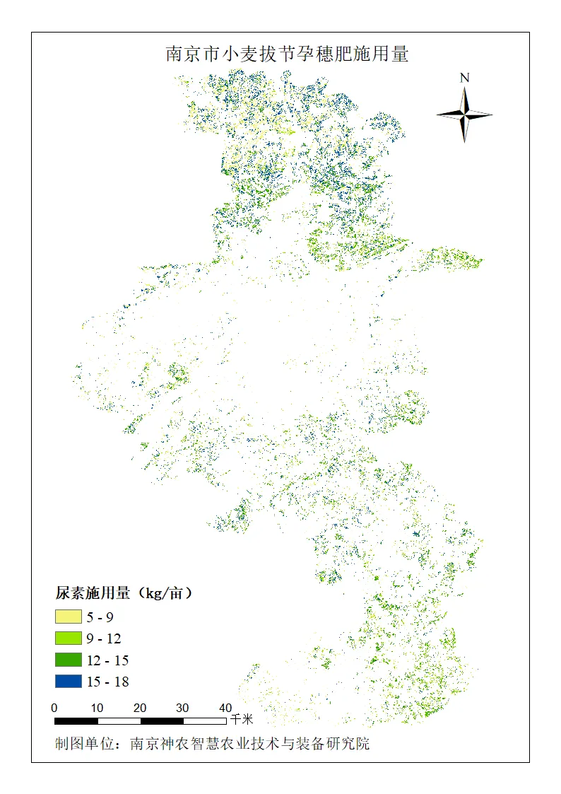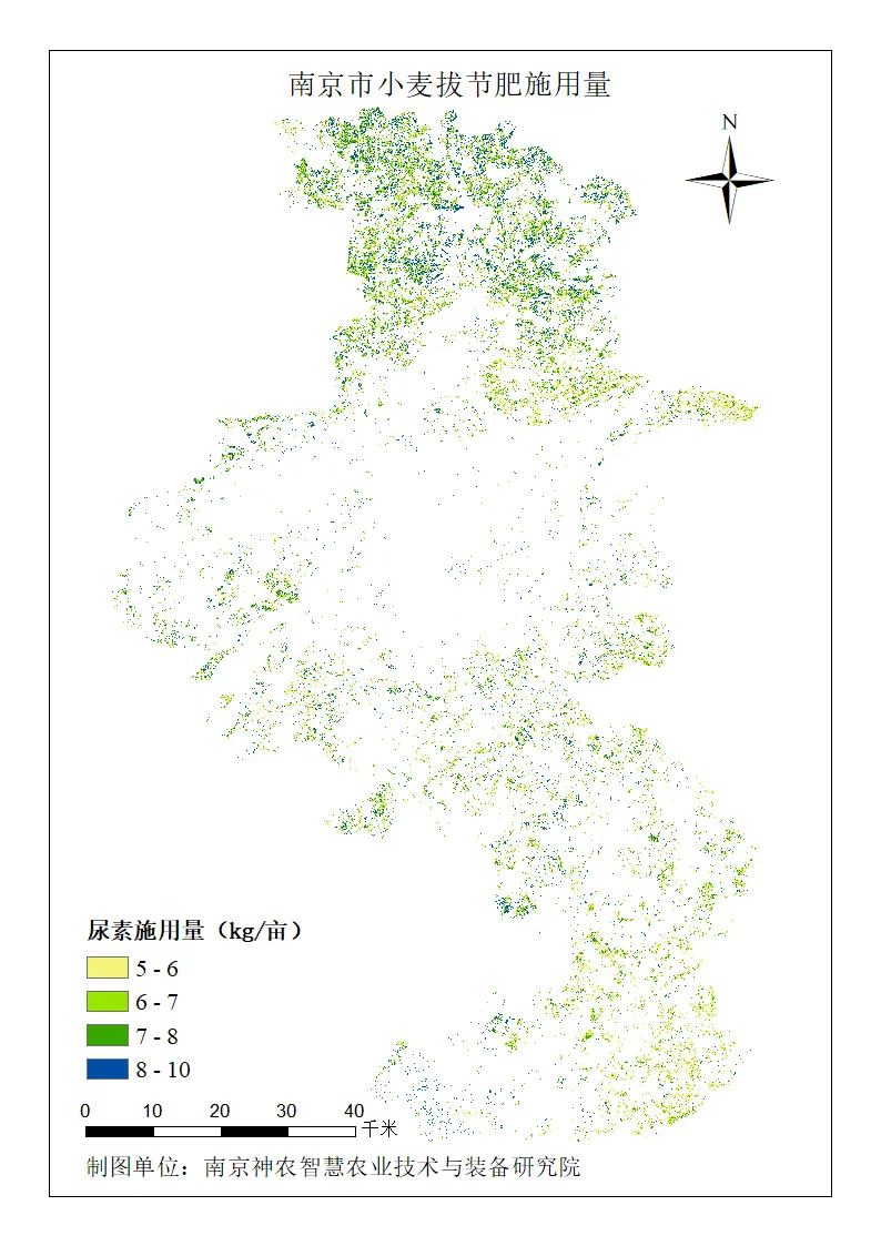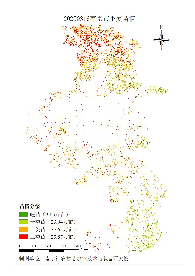 传统苗情诊断依赖人工,效率低且难以覆盖全域。卫星遥感技术通过反演植被指数,能够快速、宏观、精准地获取小麦长势空间分布,为科学管理提供数据支撑。本次分析基于近期卫星影像,覆盖南京市主要小麦种植区,完成了苗情分级评价。在此基础上,针对不同苗情类型(旺苗、一类苗、二类苗、三类苗)制定了差异化的拔节孕穗肥施用方案,并生成施肥量分布图,为精准施肥提供参考。