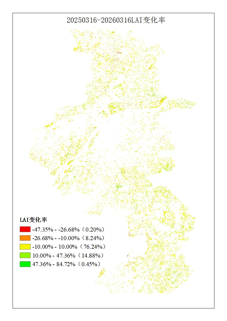 2026年3月南京市LAI(叶面积指数)较2025年同期整体呈现 “整体稳定,局部微升” 的态势。绝大部分区域LAI变化幅度较小,基本维持在正常波动范围内,正向增长区域略多于负向减少区域,整体变化处于合理区间,未出现极端恶化或异常增长现象,叶面积指数变化分布如下图2。