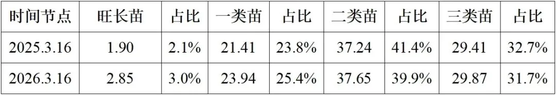 二类苗面积小幅增加,仍为主体类型。 二类苗面积由37.24万亩增至37.65万亩,占比下降1.5个百分点,但仍占近四成,是当前苗情的主体。其面积小幅增加但占比下降,主要因总面积扩大,整体结构保持稳定。