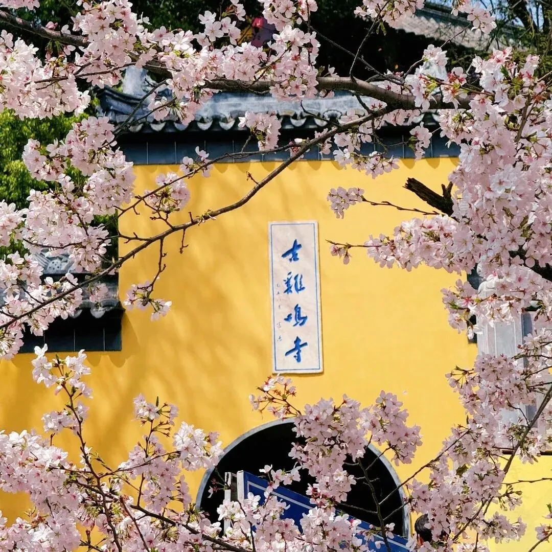 古鸡鸣寺门口,仰拍樱花+黄墙+飞檐