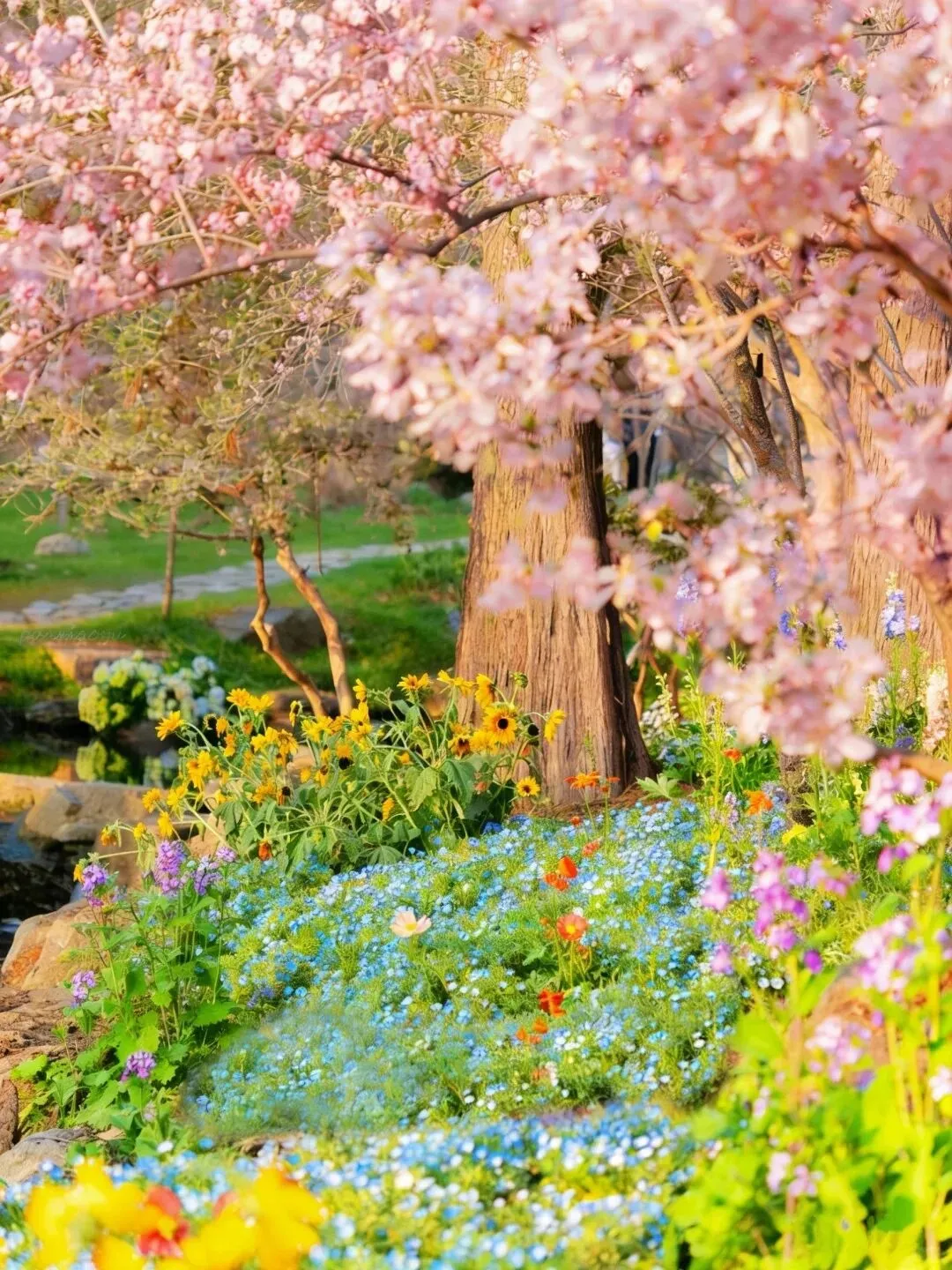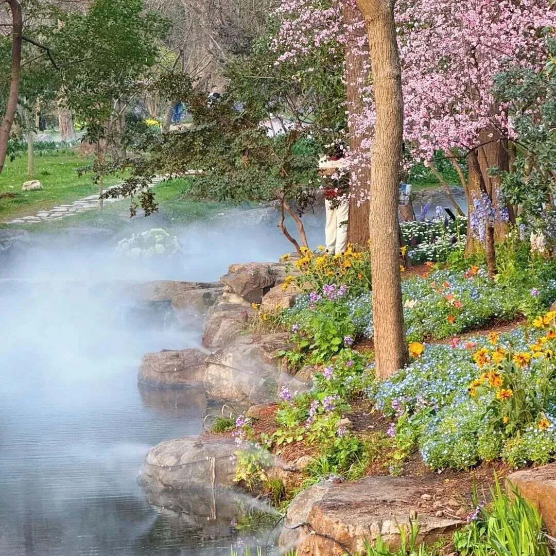 荷兰风车+郁金香花海,像走进了油画里🎨3月中下旬到4月上旬,成片的郁金香如彩虹地毯,还能坐游船看樱花倒影。