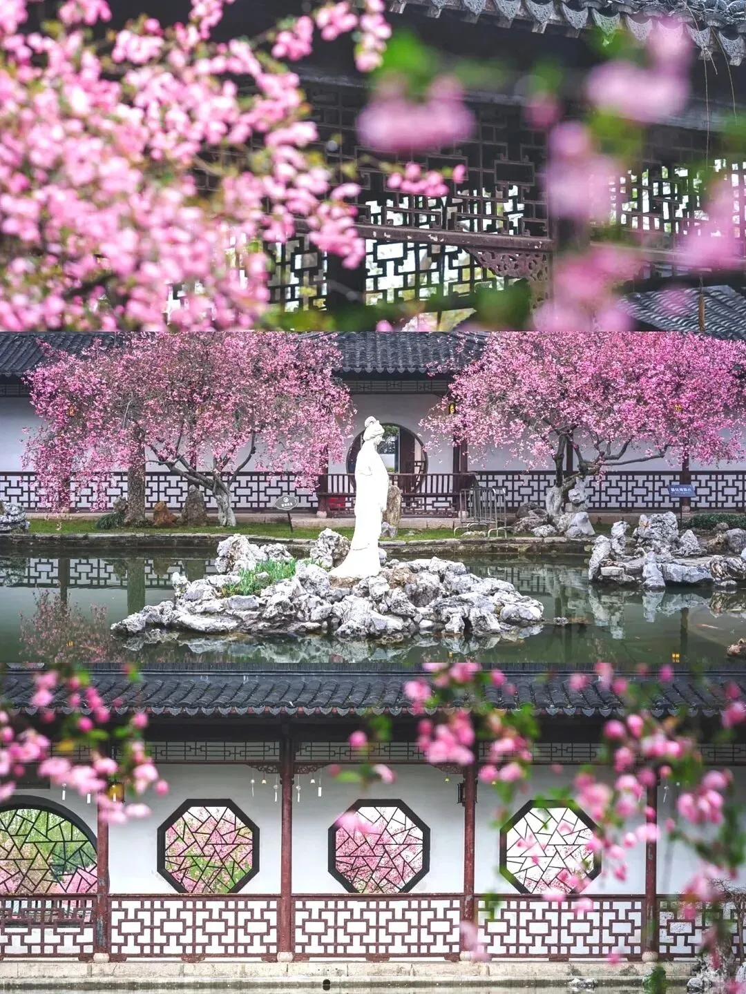 3月中下旬进入盛花期,垂丝海棠和西府海棠登场,莫愁女雕像配海棠,是经典打卡机位,预计2026年3月中下旬迎来最佳观赏期。