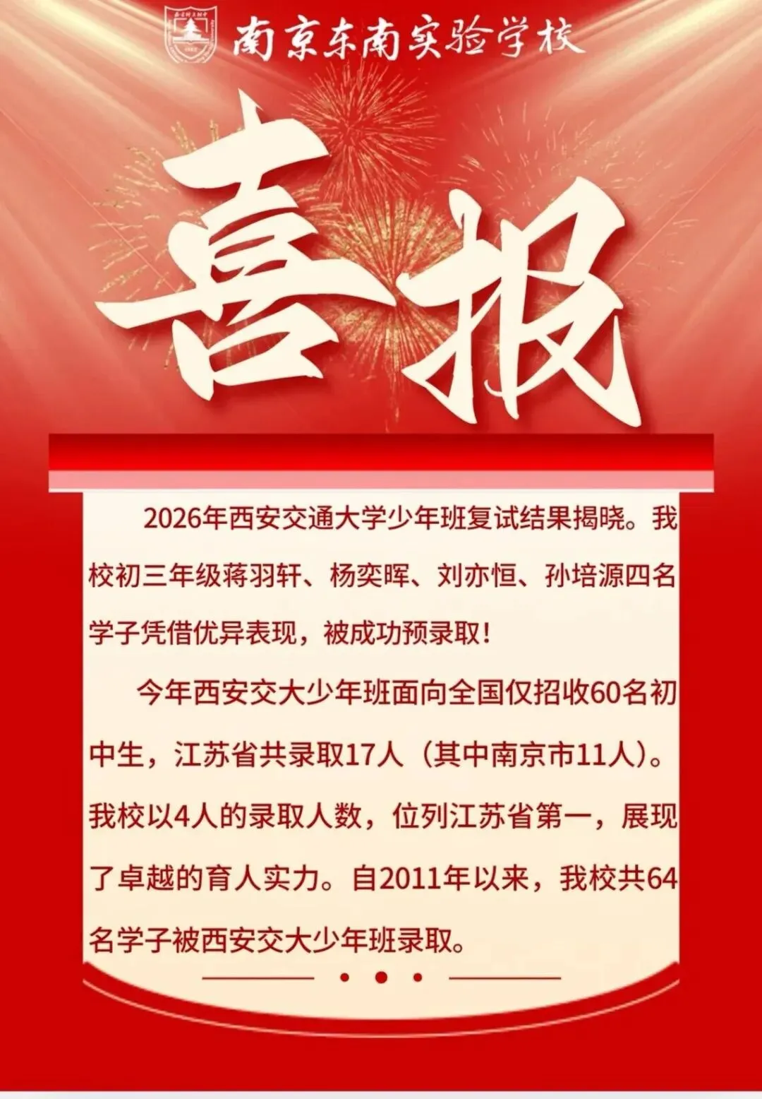 东南实验学校(南师江宁)初三年级蒋羽轩、杨奕晖、刘亦恒、孙培源四名学子凭借优异的综合实力,被成功预录取!学校录取人数位列江苏省及南京市第一,展现了卓越的培养能力。